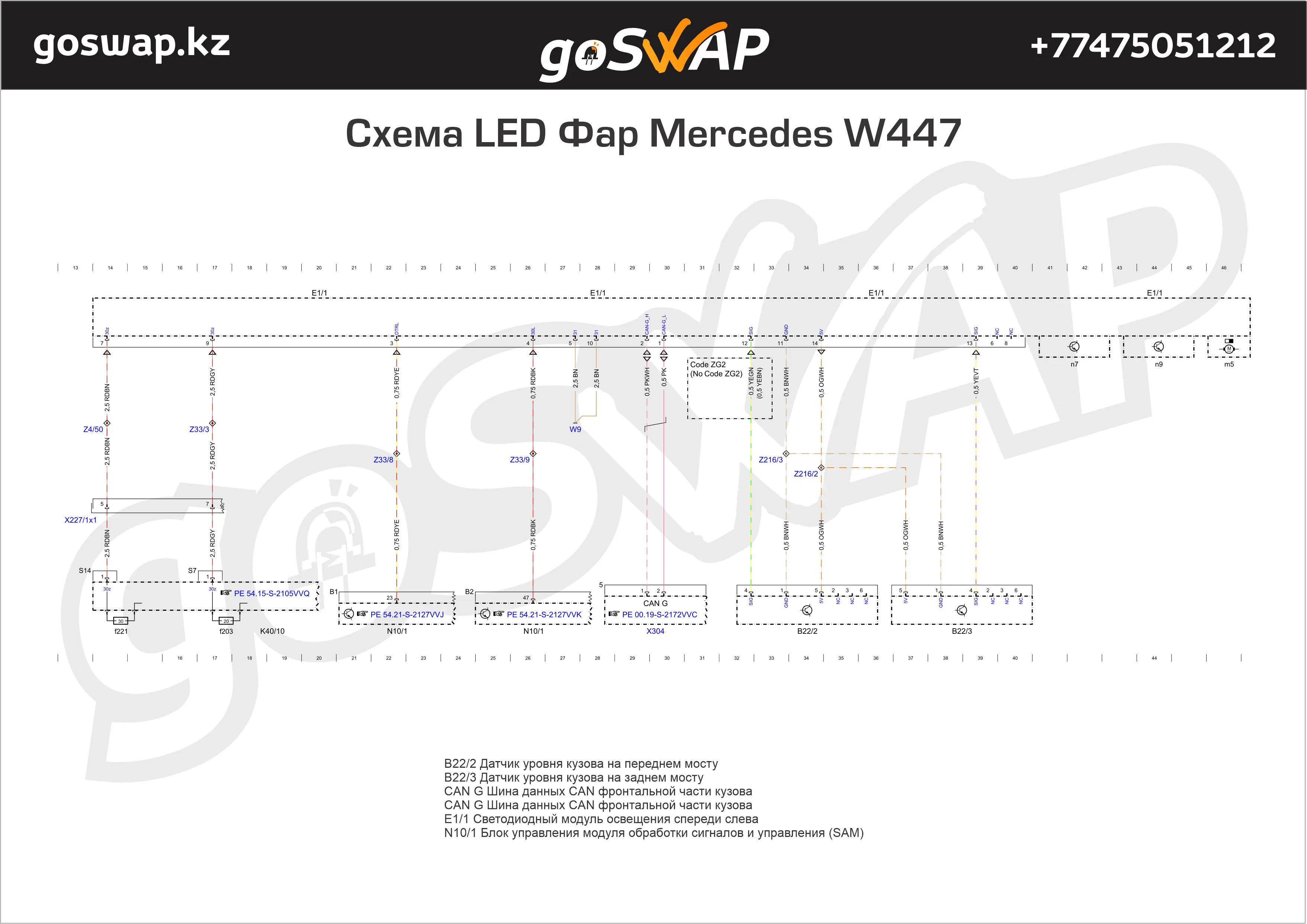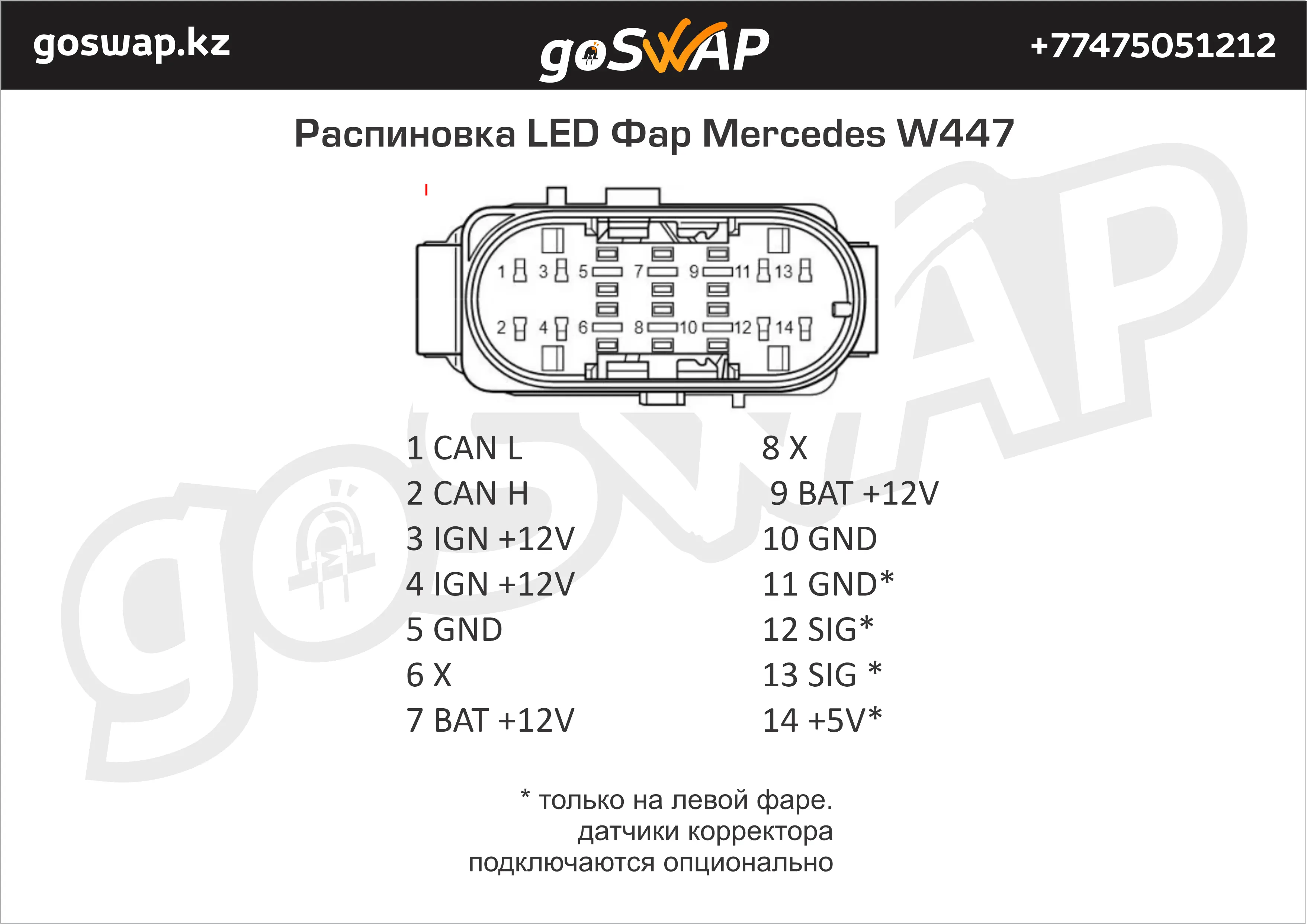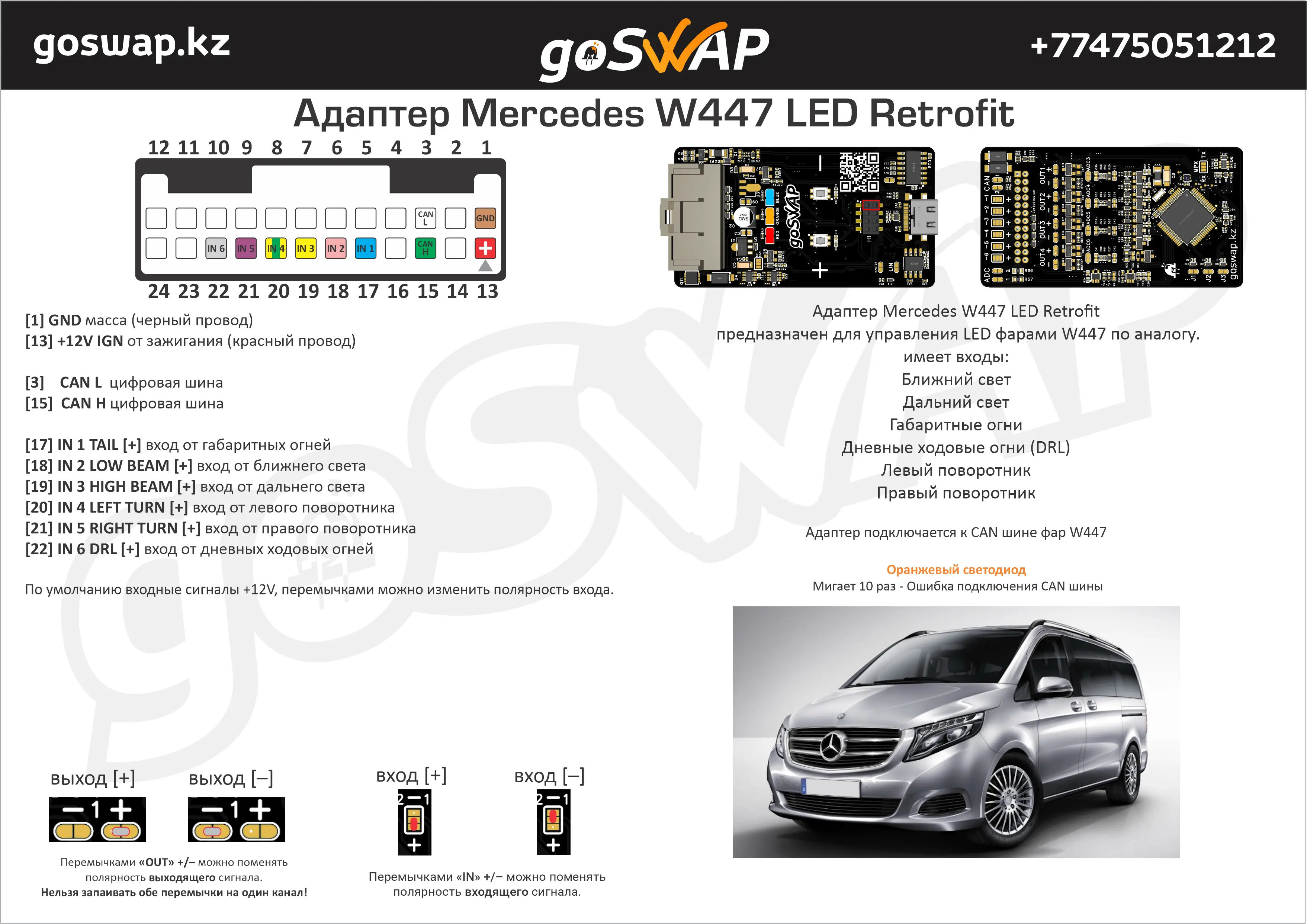 Адаптер Mercedes W447 LED Retrofit предназначен для управления LED фарами W447 по аналогу. имеет входы: Ближний свет Дальний свет Габаритные огни Дневные ходовые огни (DRL) Левый поворотник Правый поворотник