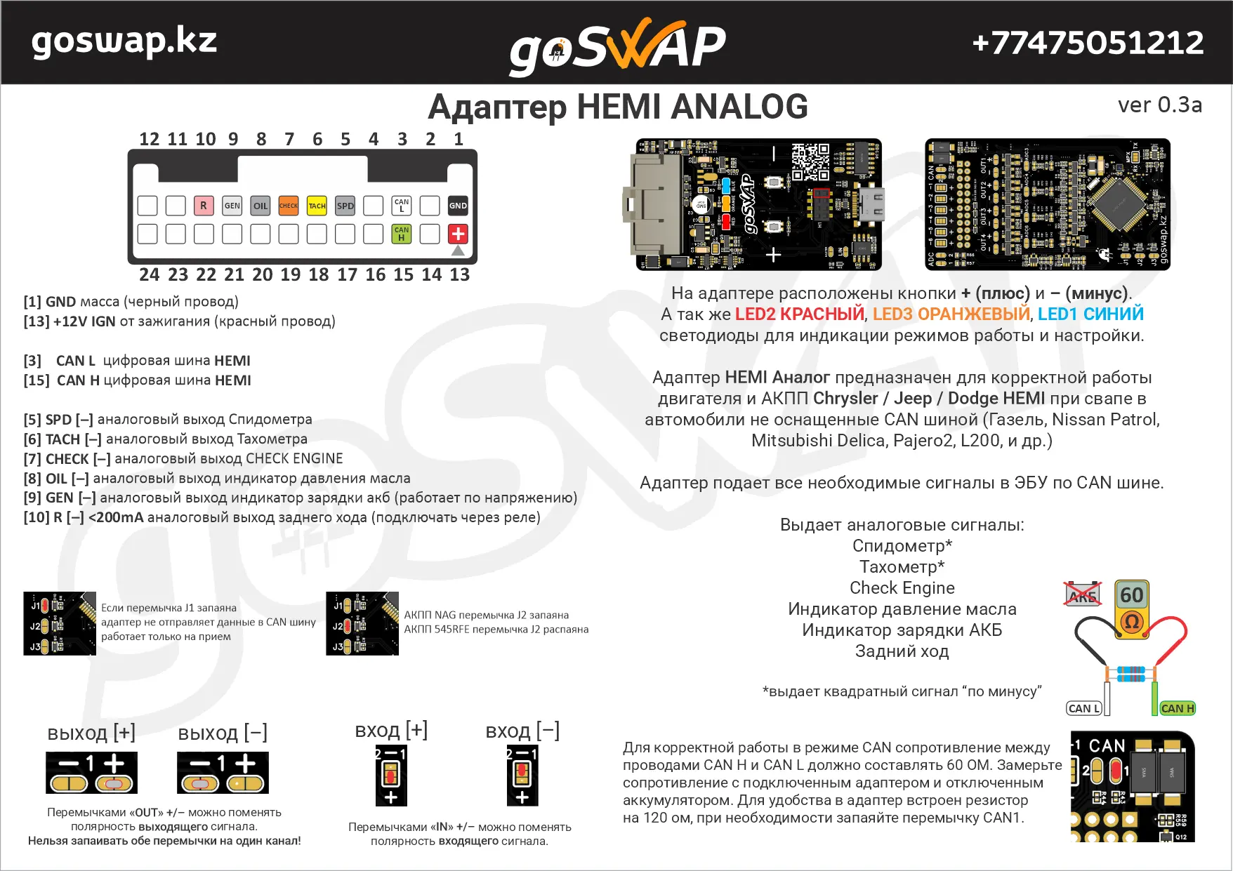 Адаптер предназначен для корректной работы двигателя Chrysler / Dodge / Jeep HEMI (~2005-2010) и АКПП 545RFE или АКПП NAG Mercedes при свапе в автомобили не оснащенные CAN шиной (Газель, Nissan Patrol, Mitsubishi Delica, Pajero2, L200, и др.) Адаптер подает все необходимые сигналы в ЭБУ по CAN шине. Выдает аналоговые сигналы: - Спидометр - Тахометр - Check Engine - Индикатор давление масла - Индикатор зарядки АКБ - Задний ход