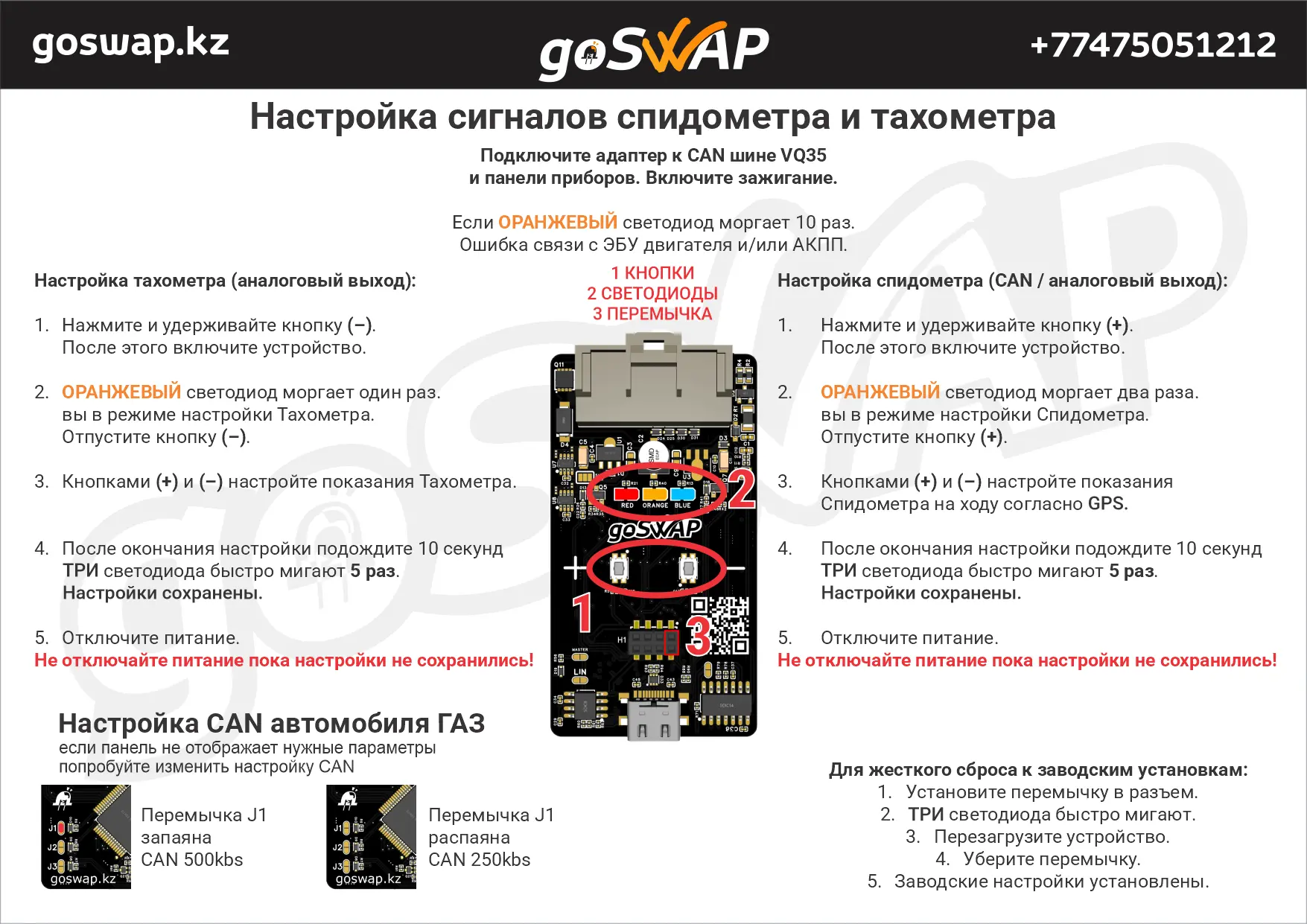 Адаптер ГАЗ VQ35 предназначен для корректной работы двигателя и АКПП Nissan VQ35 при свапе в автомобили Газель NEXT, Бизнес, NN, Соболь и т.д. оснащенных CAN шиной. На панели ГАЗ обеспечивает работу: Тахометра, Спидометра, Температуры ОЖ, Бортового компьютера и т.д. Адаптер подает все необходимые сигналы в ЭБУ по CAN шине. Обеспечивает работу Tiptronic, активирует режимы POWER/SNOW. Выдает аналоговые сигналы**: - Спидометр - Тахометр - Check Engine - AT Check - P/N Switch - Reverse ** подключаются при необходимости
