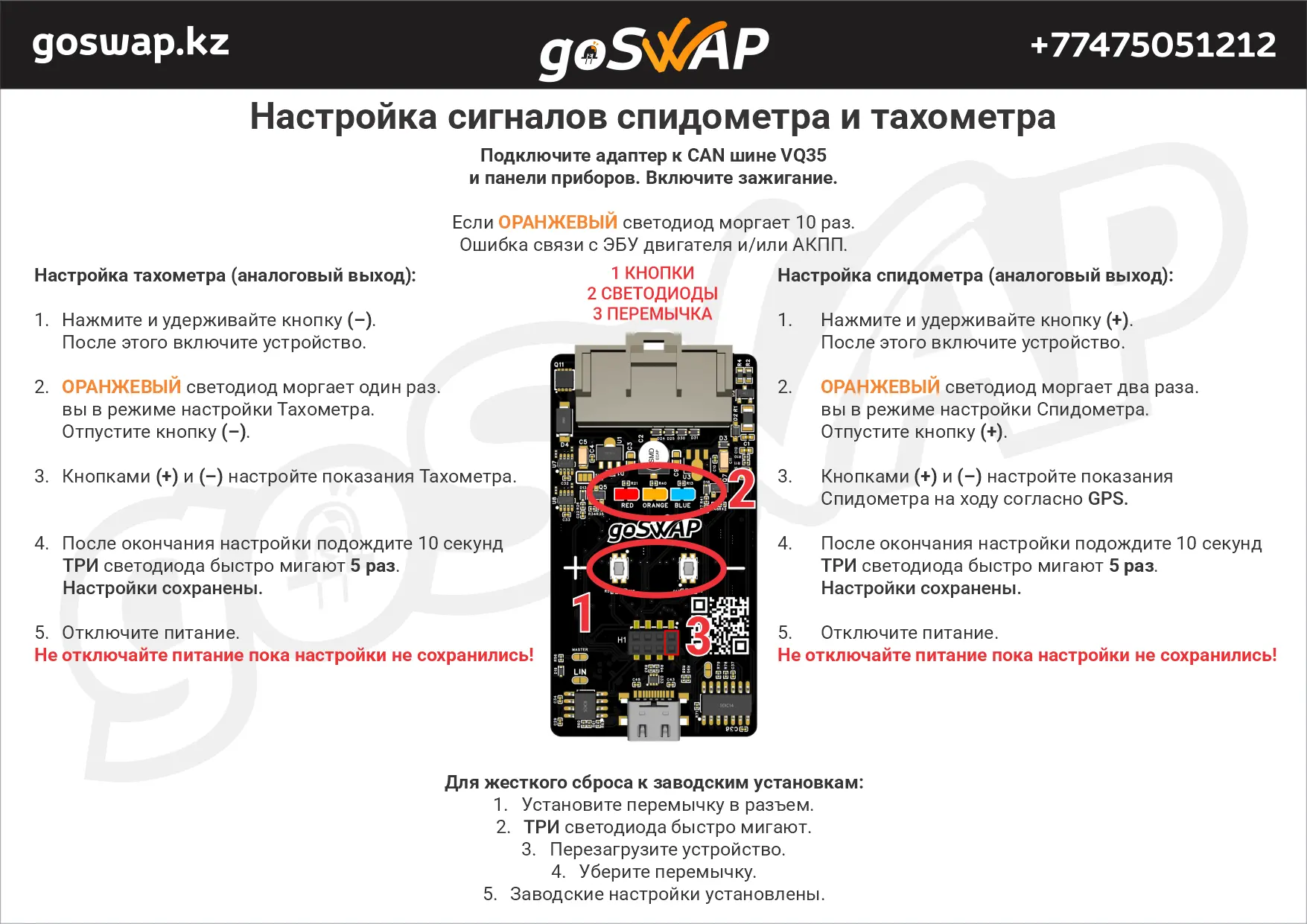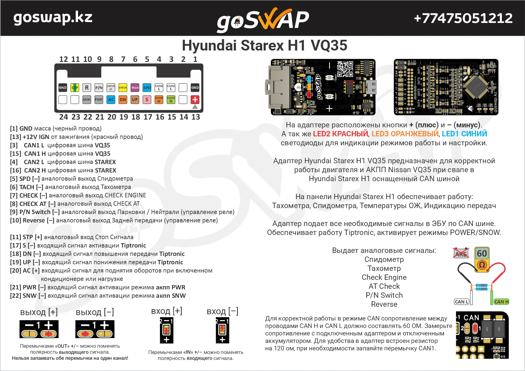 Адаптер Hyundai Starex H1 VQ35 предназначен для корректной работы двигателя и АКПП Nissan VQ35 при свапе в Hyundai Starex H1 оснащенный CAN шиной. На панели Hyundai Starex H1 обеспечивает работу: Тахометра, Спидометра, Температуры ОЖ, Индикацию передач. Адаптер подает все необходимые сигналы в ЭБУ по CAN шине. Обеспечивает работу Tiptronic, активирует режимы POWER/SNOW. Выдает аналоговые сигналы: - Спидометр - Тахометр - Check Engine - AT Check - P/N Switch - Reverse