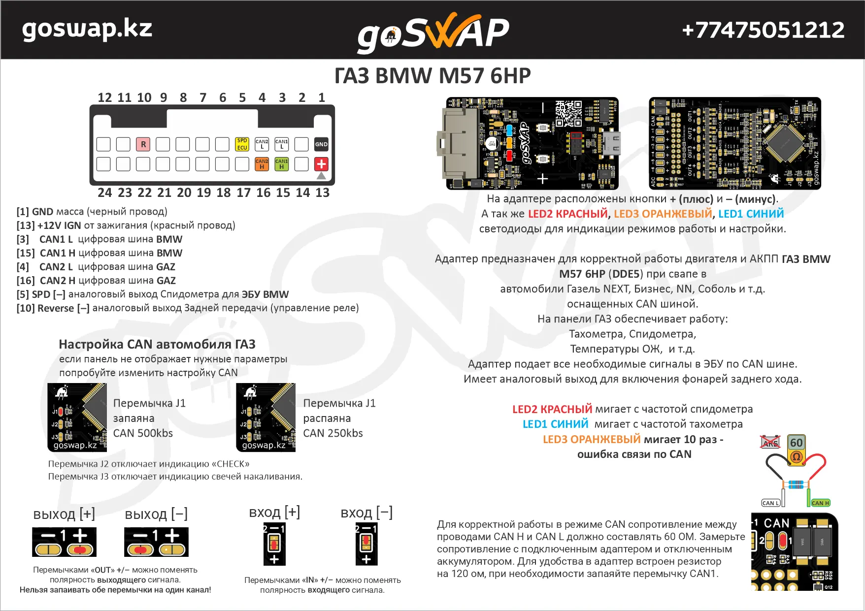 Адаптер предназначен для корректной работы двигателя и АКПП BMW M57 6HP (DDE5) при свапе в автомобили Газель NEXT, Бизнес, NN, Соболь и т.д. оснащенных CAN шиной. На панели ГАЗ обеспечивает работу: Тахометра, Спидометра, Температуры ОЖ, и т.д. Адаптер подает все необходимые сигналы в ЭБУ по CAN шине. Имеет аналоговый выход для включения фонарей заднего хода.