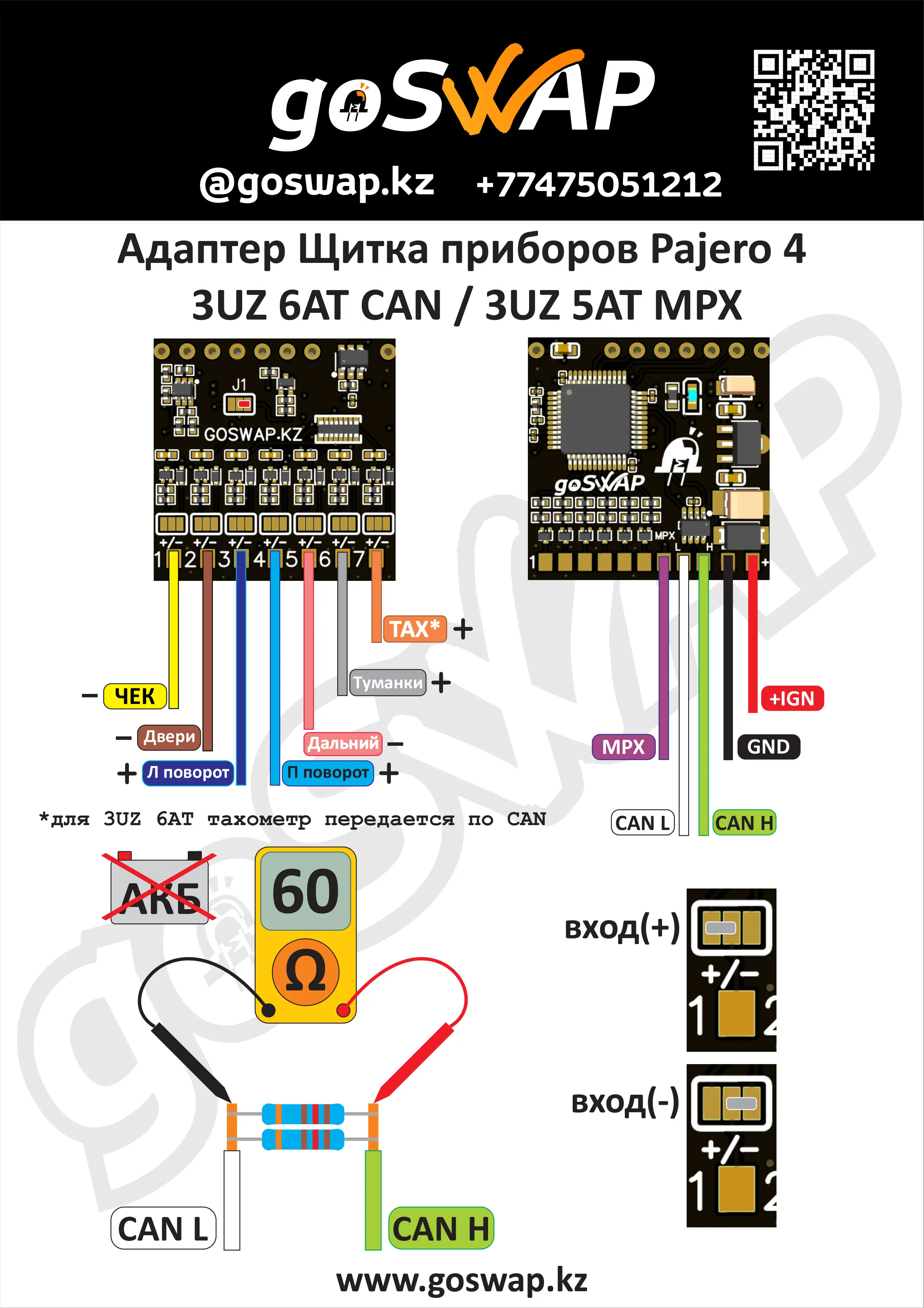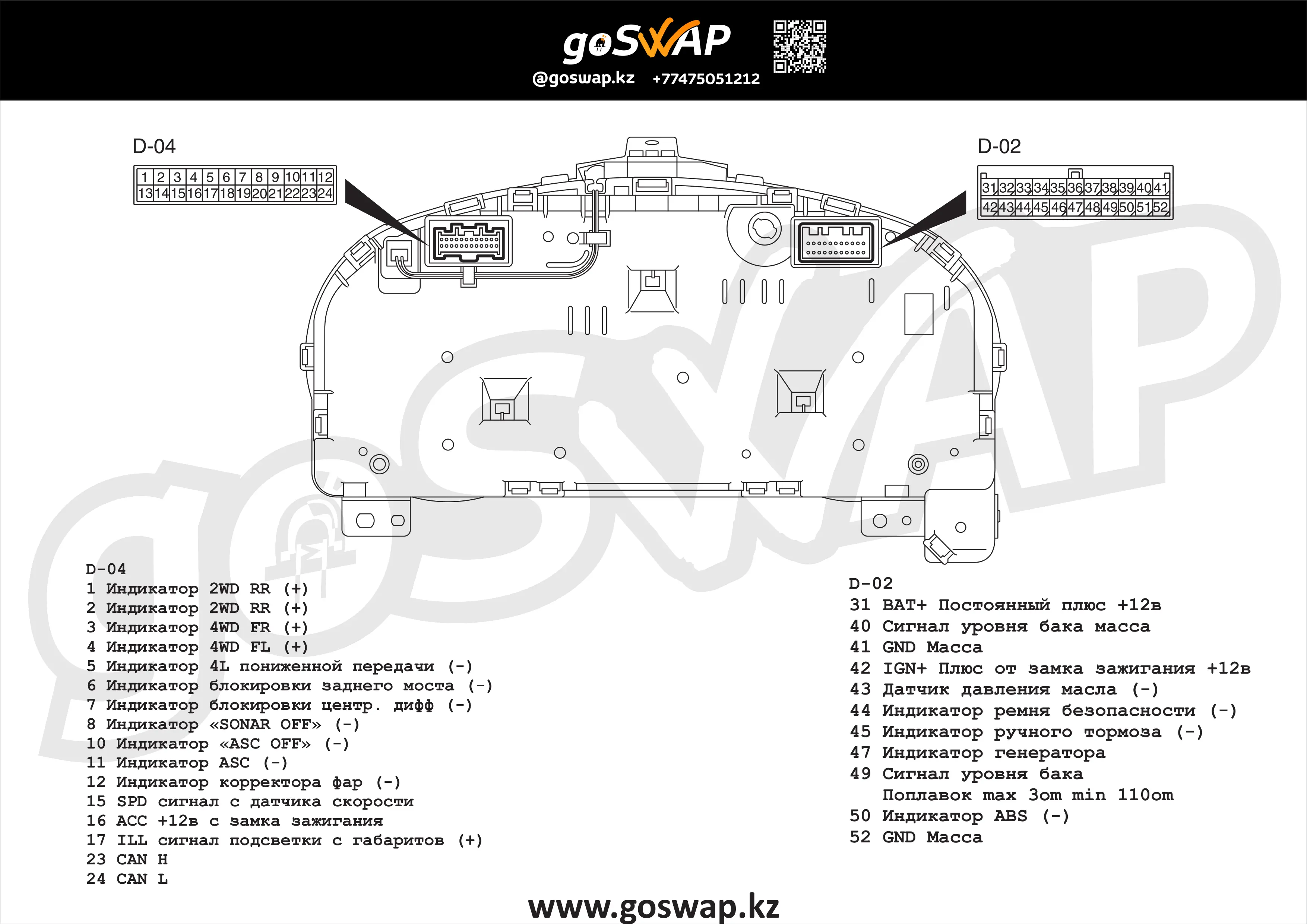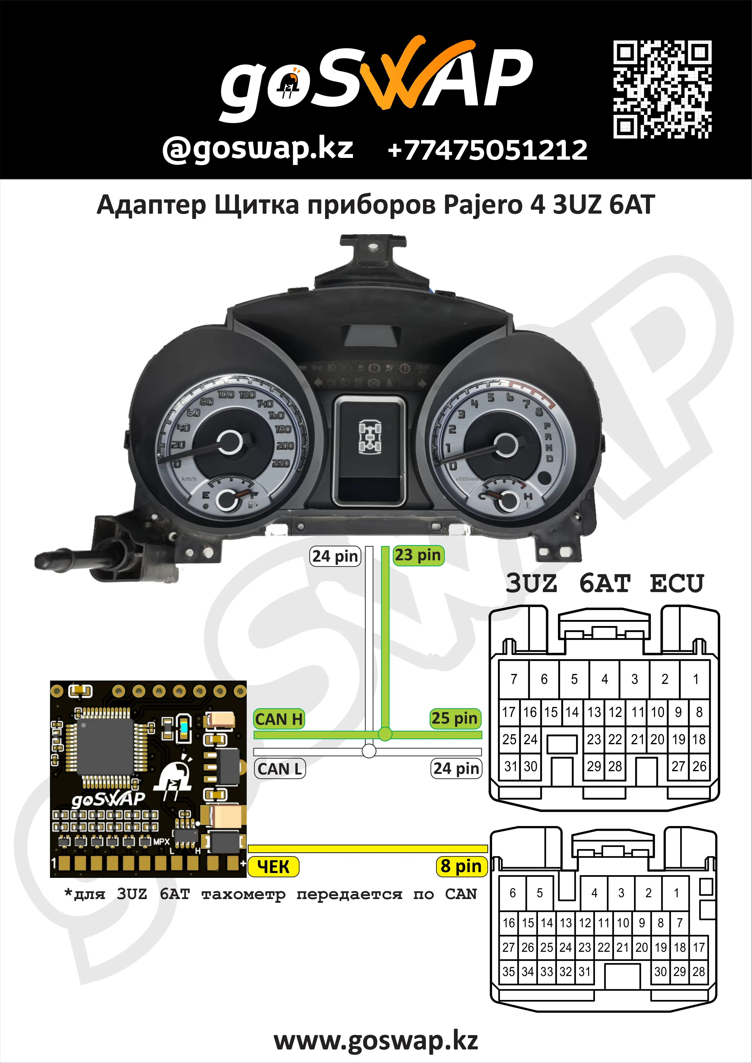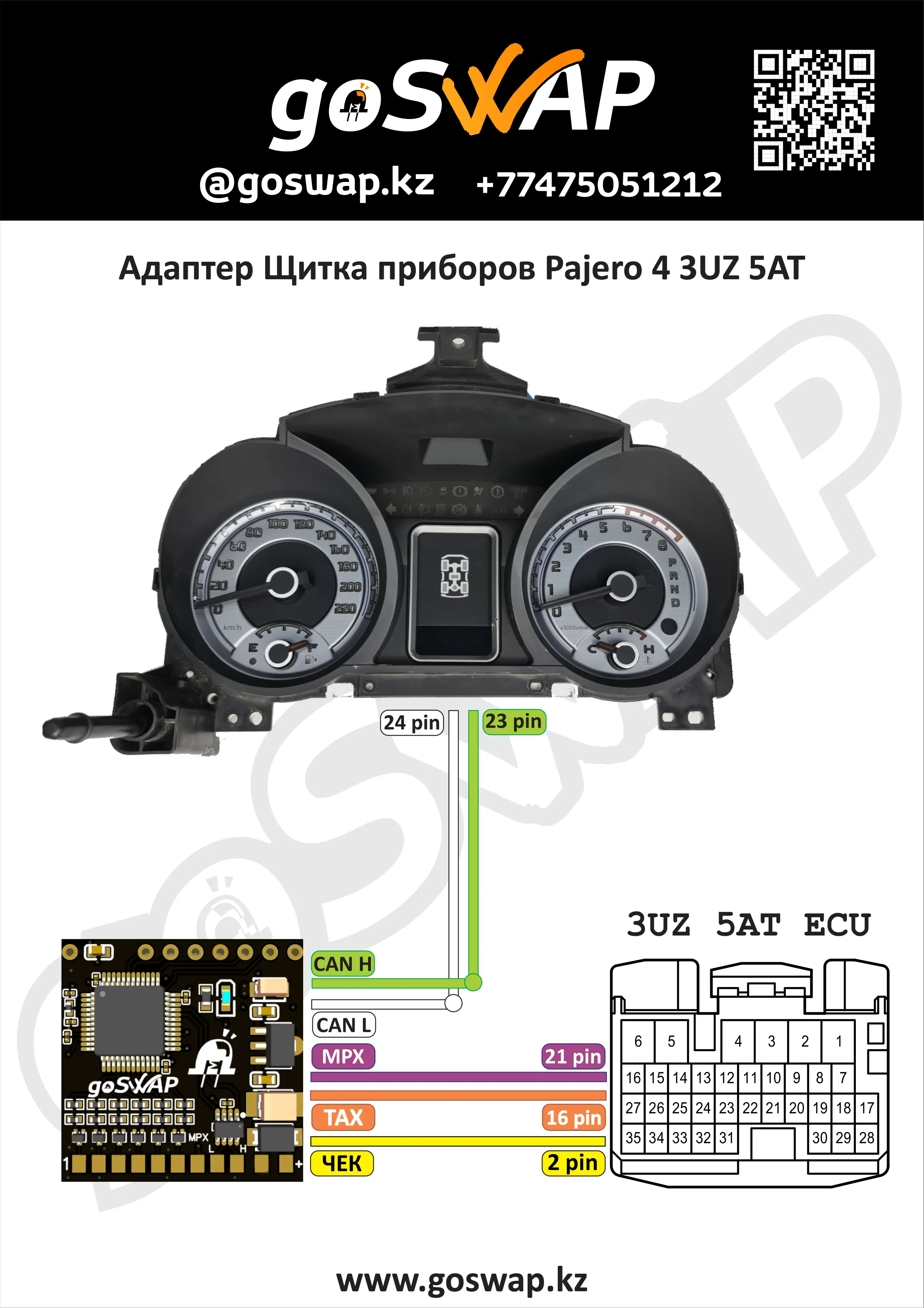 Адаптер для установки щитка приборов Pajero 4 с двигателями: - Toyota 3UZ 6AT CAN - Toyota 3UZ 5AT MPX - Toyota 3GR CAN - Toyota 4GR CAN - Toyota 2JZ MPX Необходимые индикаторы подключаются согласно схеме в адаптер и щиток приборов. Данный адаптер не подходит для свапа двигателя в Pajero 4! Запускает только щиток!