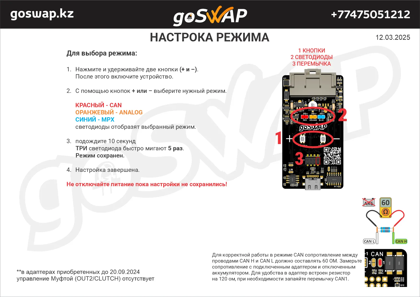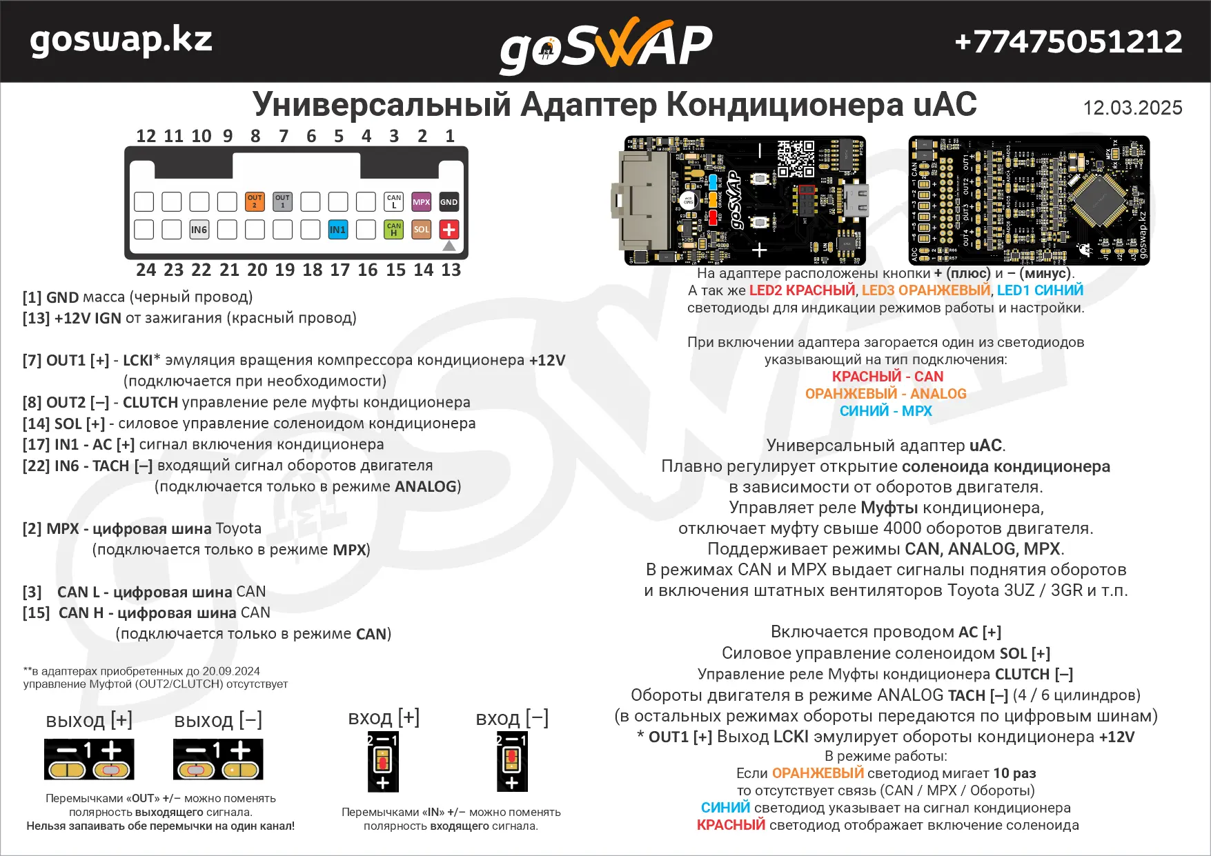 Плавно регулирует открытие в зависимости от оборотов двигателя. Управляет реле кондиционера, отключает муфту свыше 4000 оборотов двигателя. Поддерживает режимы CAN, ANALOG, MPX В режимах CAN и MPX выдает сигналы поднятия оборотов и включения штатных вентиляторов Toyota 3UZ / 3GR и т.п. Включается проводом AC [+] Силовое управление соленоидом SOL [+] Управление реле Муфты кондиционера CLUTCH [–]** Обороты двигателя в режиме ANALOG TACH [–] (4 / 6 цилиндров) (в остальных режимах обороты передаются по цифровым шинам) * OUT1 [+] Выход эмулирует обороты кондиционера +12V ** в адаптерах приобретенных до 20.09.2024 управление Муфтой (OUT2/CLUTCH) отсутствует