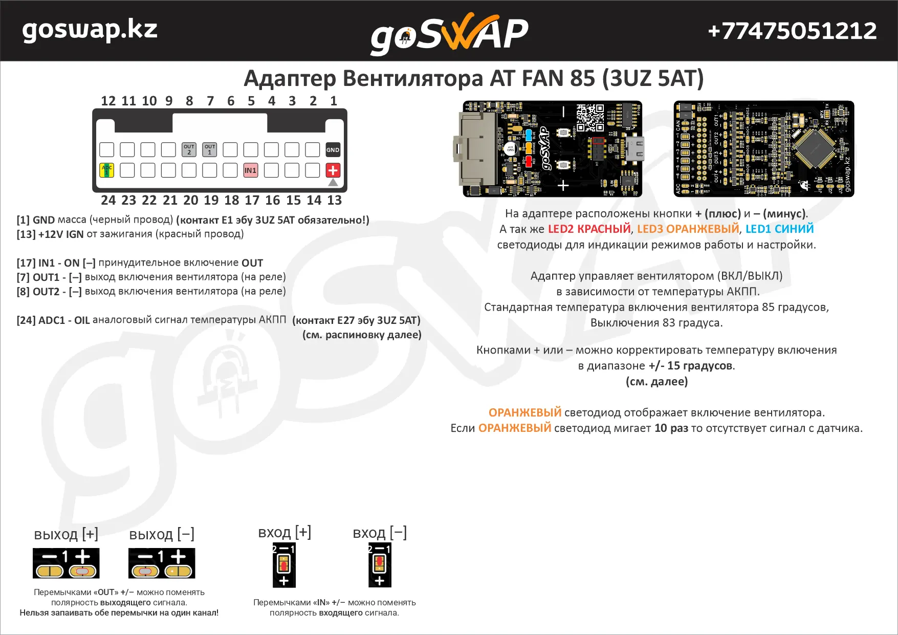 Адаптер управляет вентилятором (ВКЛ/ВЫКЛ) в зависимости от температуры АКПП. Стандартная температура включения вентилятора 85 градусов, Выключения 83 градуса. Кнопками + или – можно корректировать температуру включения в диапазоне +/- 15 градусов.