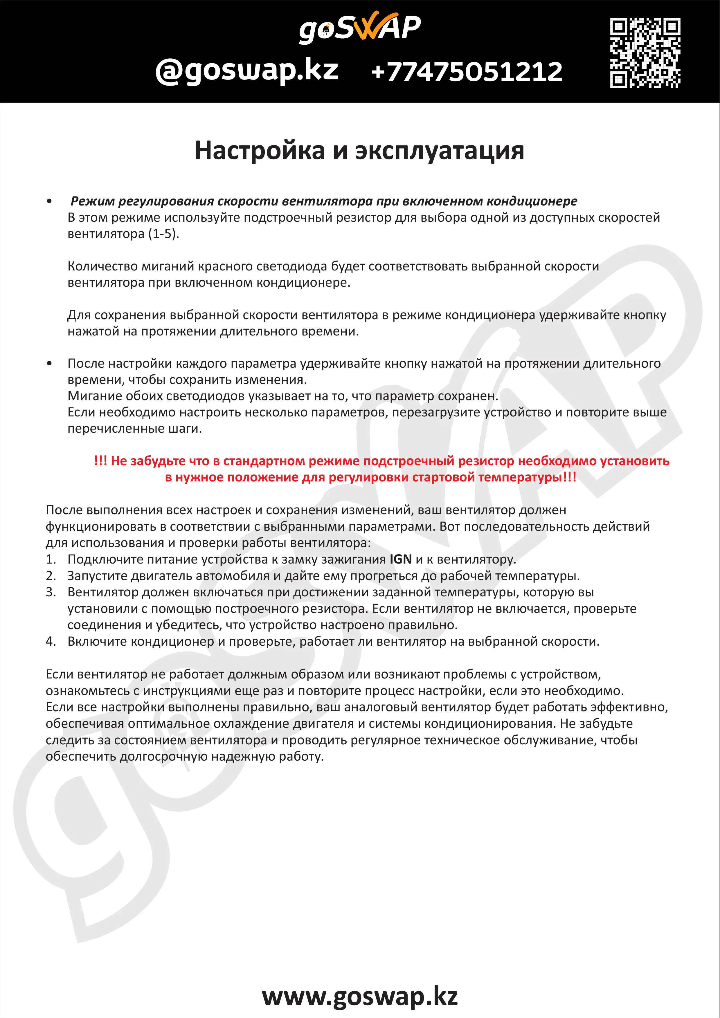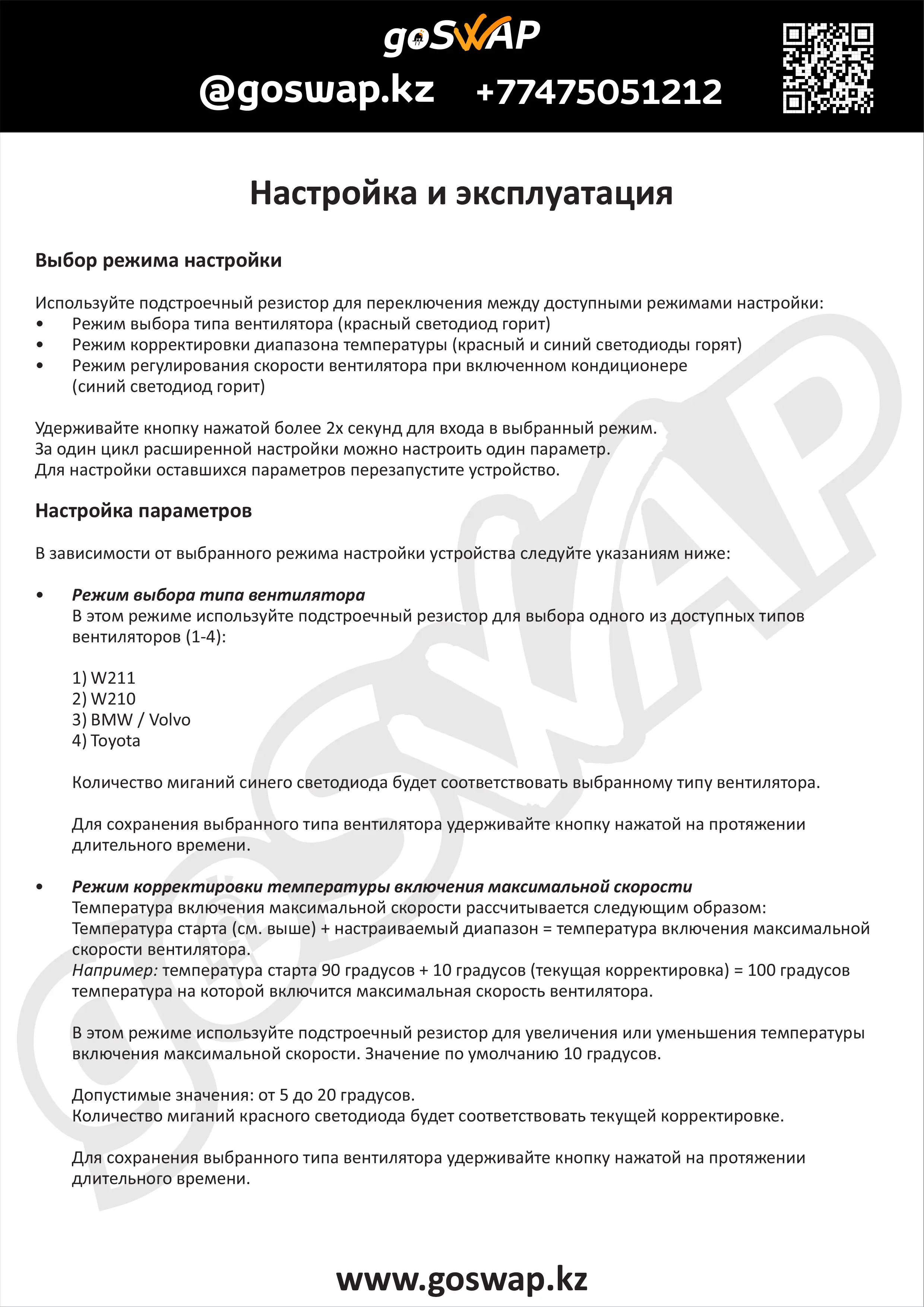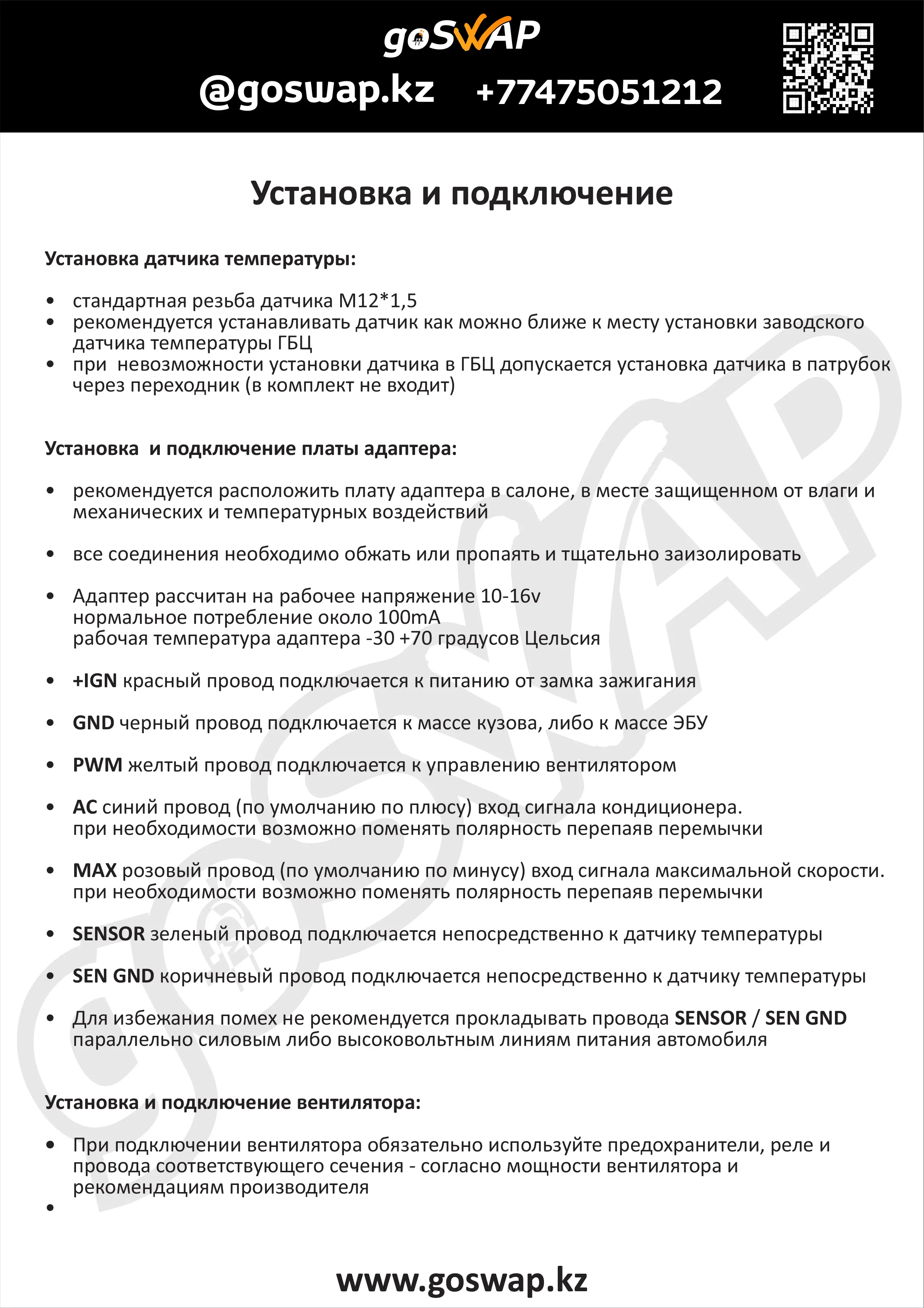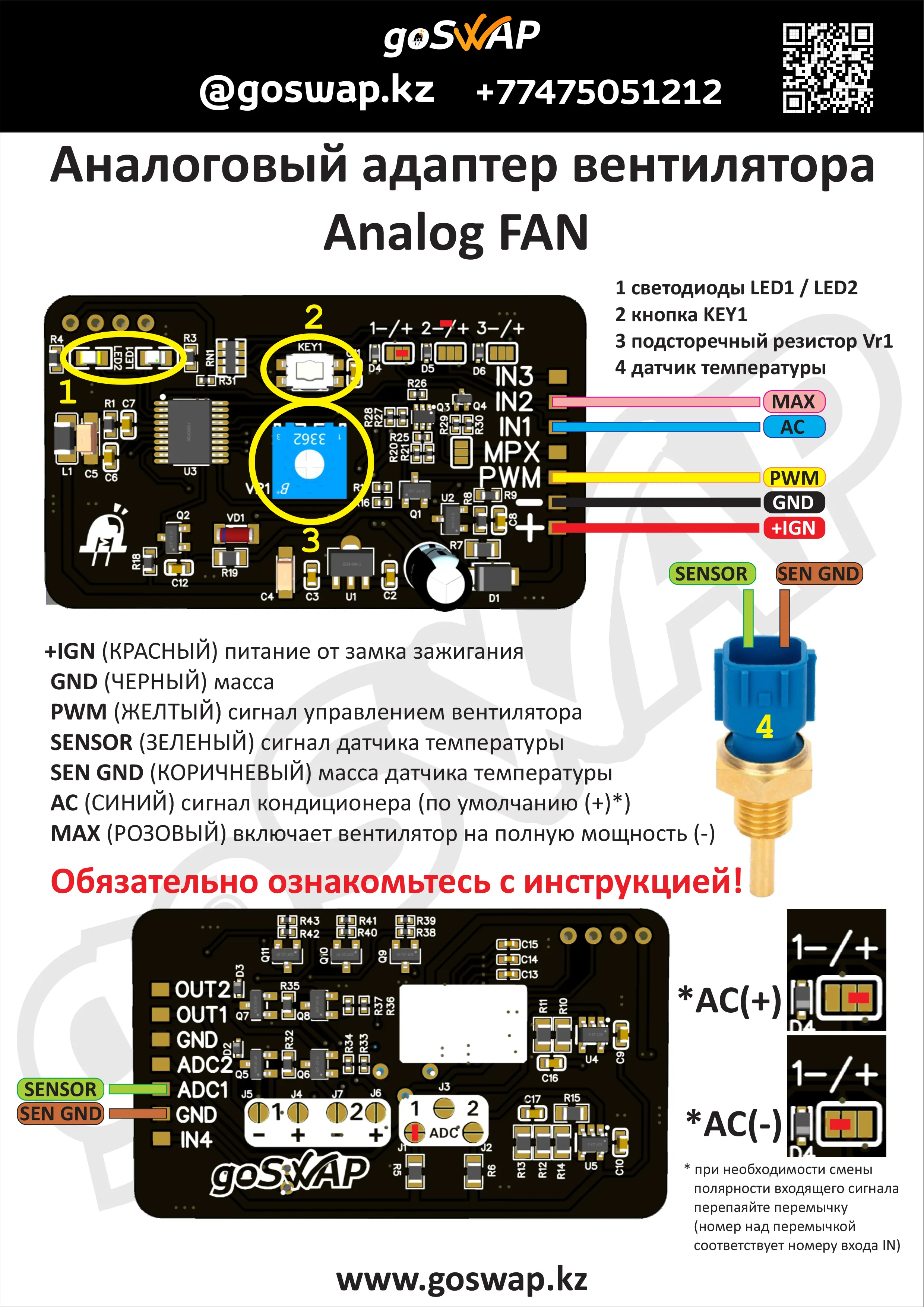 Аналоговый адаптер управления вентилятором Analog FAN позволяет управлять цифровым вентилятором в автомобилях не оборудованных современными системами управления двигателем, посредствам установки дополнительного датчика (входит в комплект) в систему охлаждения. - 5 скоростей вентилятора работают в настраиваемом диапазоне - Режим кондиционера - Режим принудительного включения на 100%. Для подробного ознакомления скачайте инструкцию ниже. Список поддерживаемых вентиляторов: Mercedes: W211, W463, W203, W210, W220 и другие. VW / Audi / Porsche: A8, A6, Q7, Touareg, Cayenne, Caddy и другие. BMW: E60, E70, E46 и другие. Volvo: S80, S60, XC90, и другие. Toyota / Lexus: Crown Majesta, Celsior, Rx350, Camry, LS430, LS460 и другие. Если вашего вентилятора нет в списке, напишите нам.