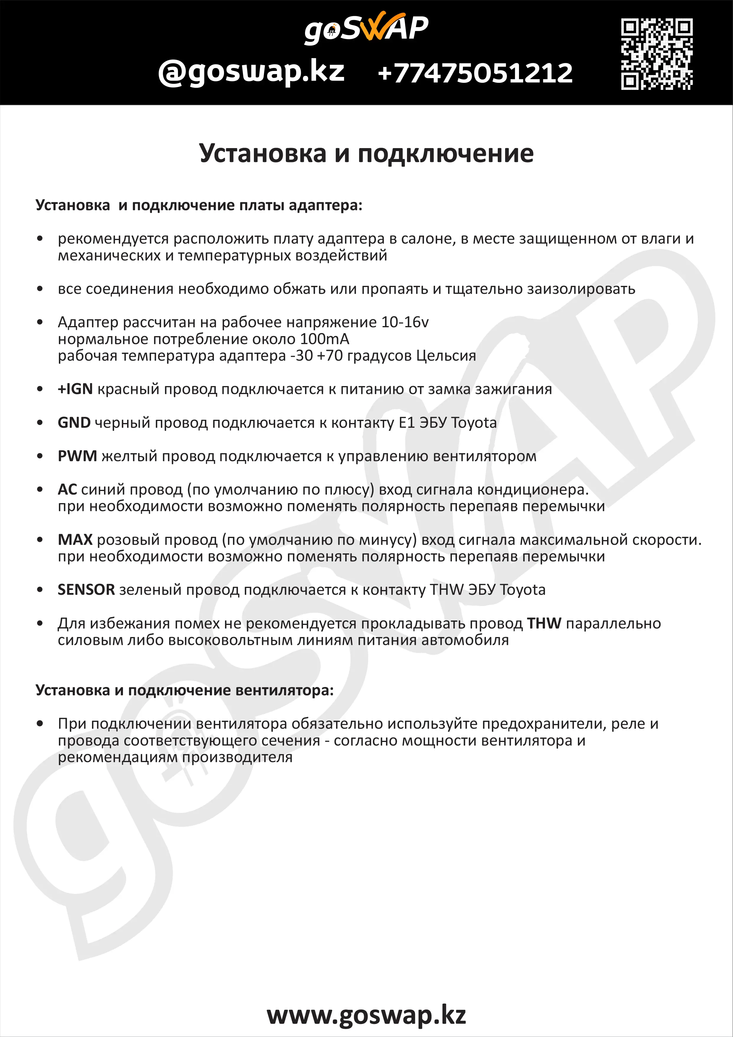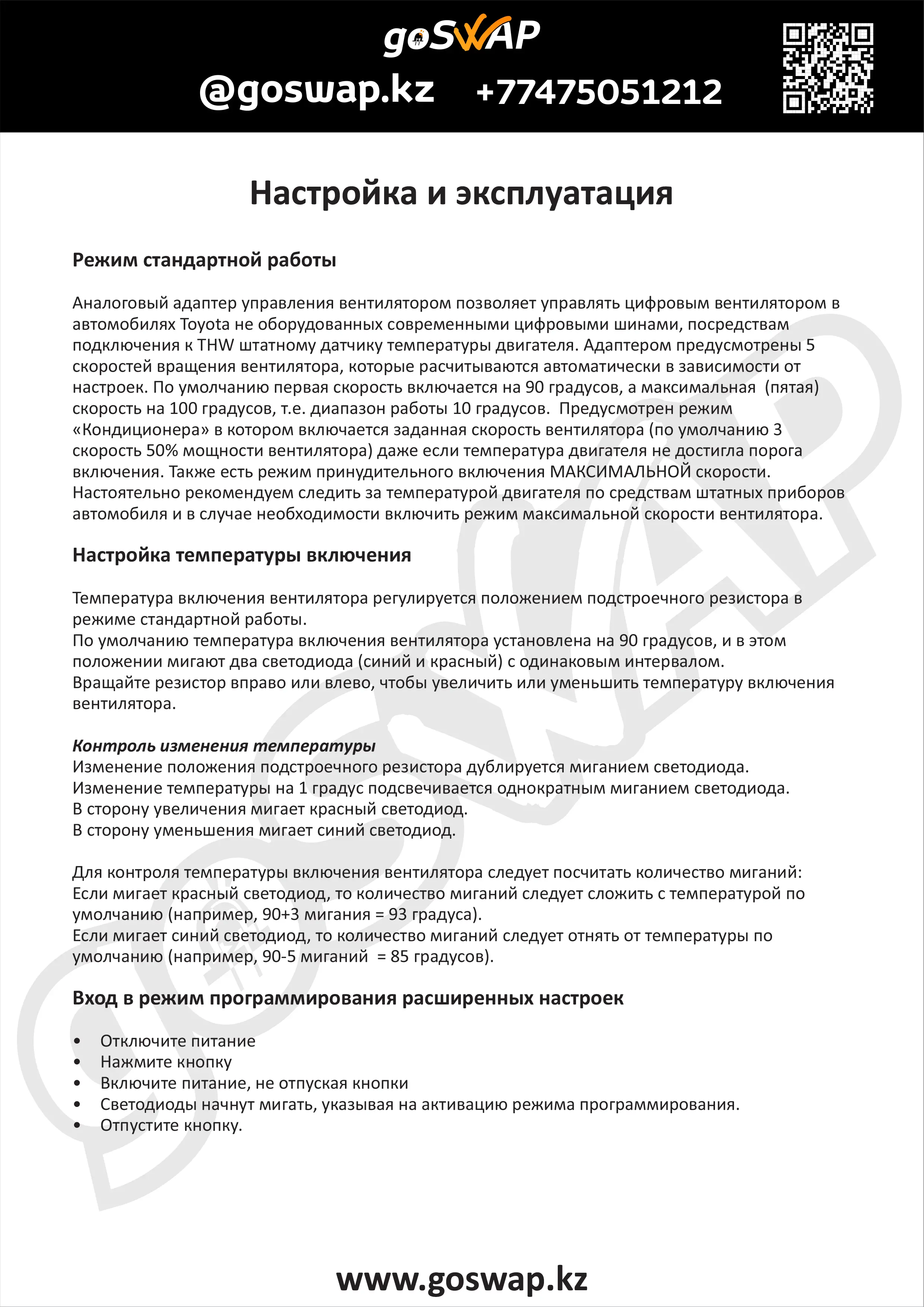 Аналоговый адаптер управления вентилятором Toyota THW Analog FAN позволяет управлять цифровым вентилятором в автомобилях с двигателем Toyota / Lexus не оснащенных цифровыми шинами, посредствам подключения к THW штатному датчику температуры двигателя. - 5 скоростей вентилятора работают в настраиваемом диапазоне - Режим кондиционера - Режим принудительного включения на 100%. Совместим с двигателями: - 5VZ, 3VZ, 4VZ - 1JZ, 2JZ, 1UZ - 1MZ, 2MZ - 3RZ, 1GR - И другие Для подробного ознакомления скачайте инструкцию ниже. Список поддерживаемых вентиляторов: Mercedes: W211, W463, W203, W210, W220 и другие. VW / Audi / Porsche: A8, A6, Q7, Touareg, Cayenne, Caddy и другие. BMW: E60, E70, E46 и другие. Volvo: S80, S60, XC90, и другие. Toyota / Lexus: Crown Majesta, Celsior, Rx350, Camry, LS430, LS460 и другие. Если вашего вентилятора нет в списке, напишите нам.