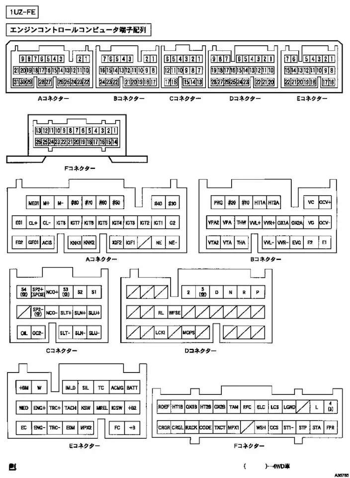 Распиновка 1UZ VVTi Crown 15* (большие катушки) Номера ЭБУ: 89661-3A300 2WD 5AT, 89661-3A320 4WD 4AT